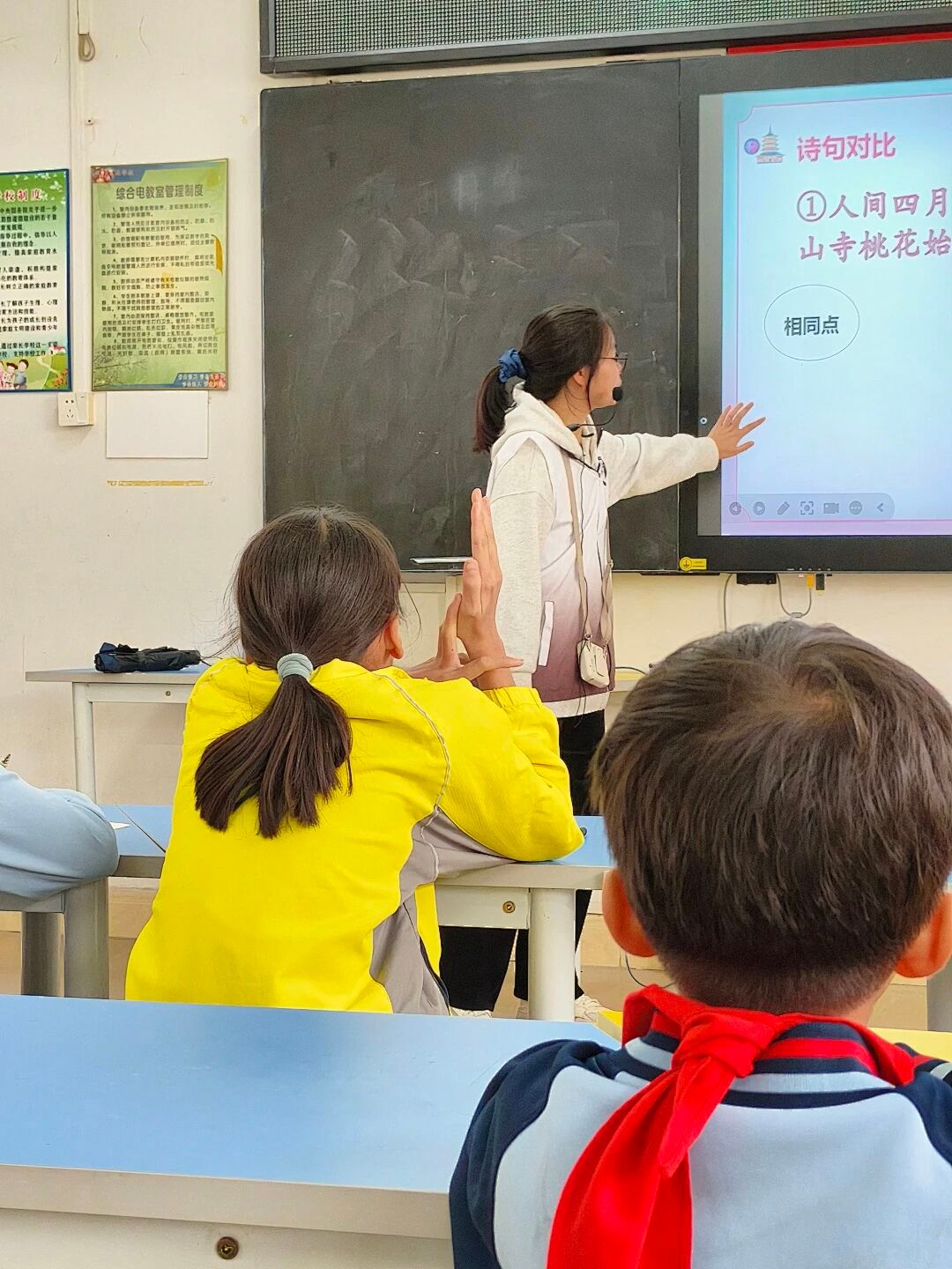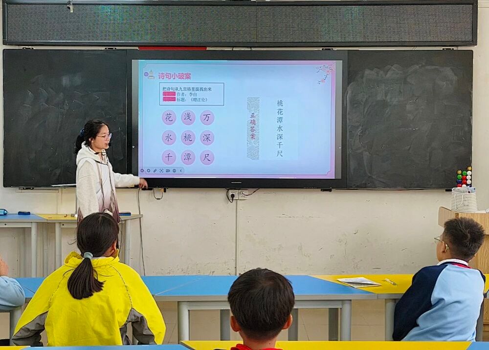 在正式上课之前,小卢老师以小游戏的形式帮助同学们回顾过去学过的和桃花有关的古诗,成功激发了学生们的兴趣。同学们热情高涨,纷纷举手抢答。通过这个小游戏,小卢老师引出了今天学习的主题:《大林寺桃花》,对大林寺和白居易进行了介绍,并引导同学们进行朗读,让大家对这首诗有了初步的认识,仿佛真正走入了那片桃林。