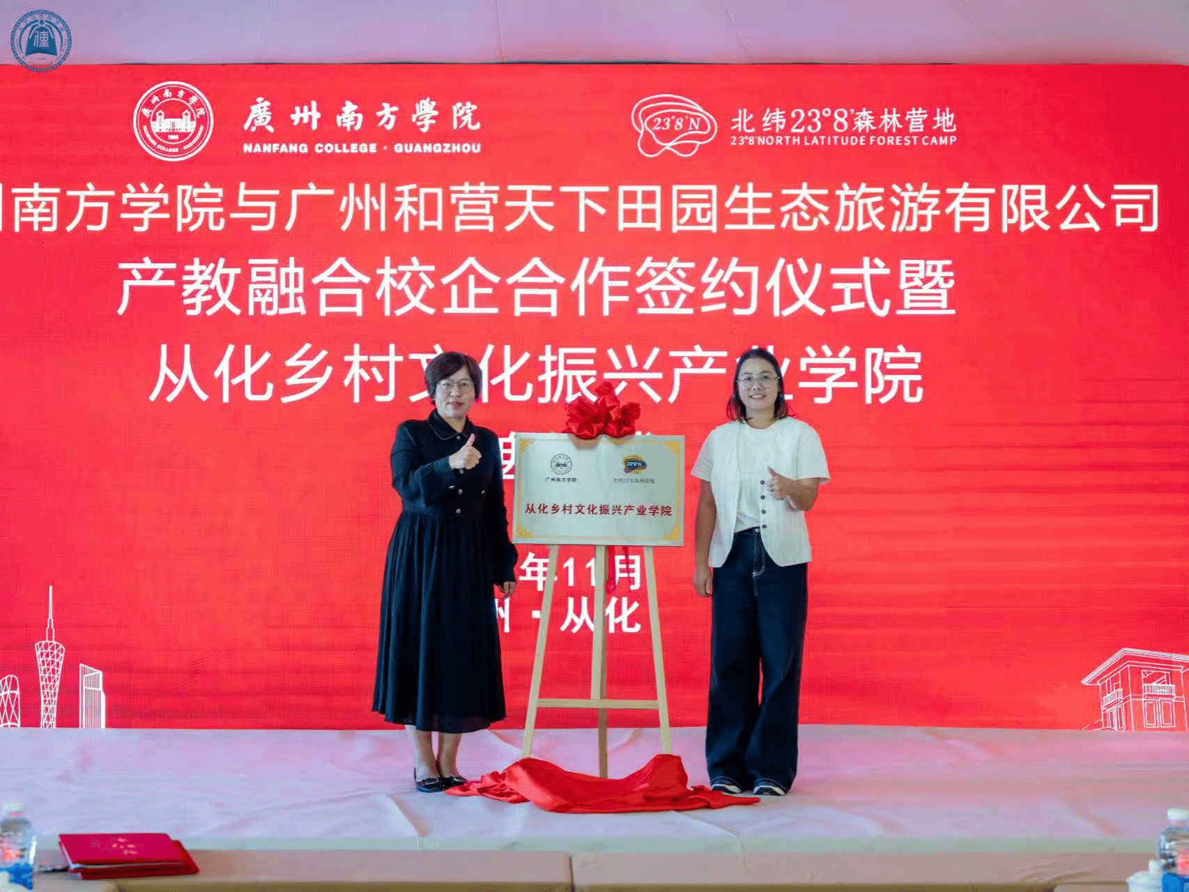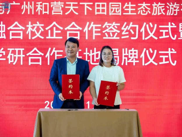 座谈会后,严五胤处长与周宝莹总经理共同签署了产教融合校企合作协议,并为产学研合作基地揭牌;周凤玲副院长与周宝莹总经理一同为从化乡村文化振兴产业学院揭牌。仪式在融洽的氛围中圆满结束。