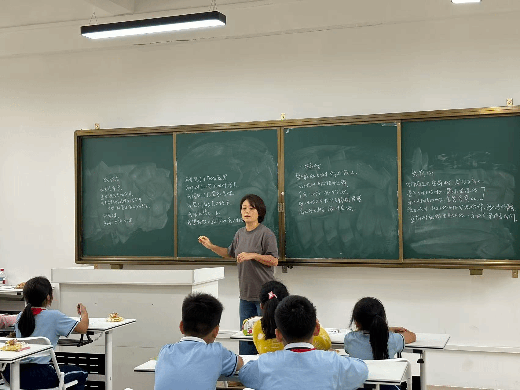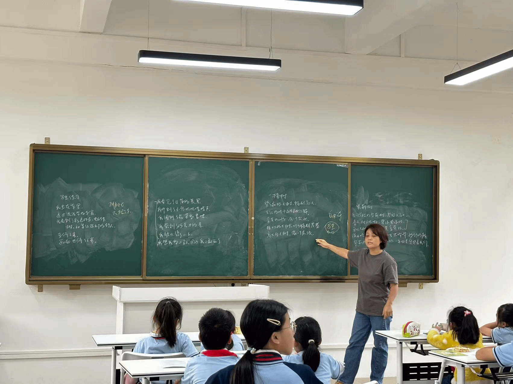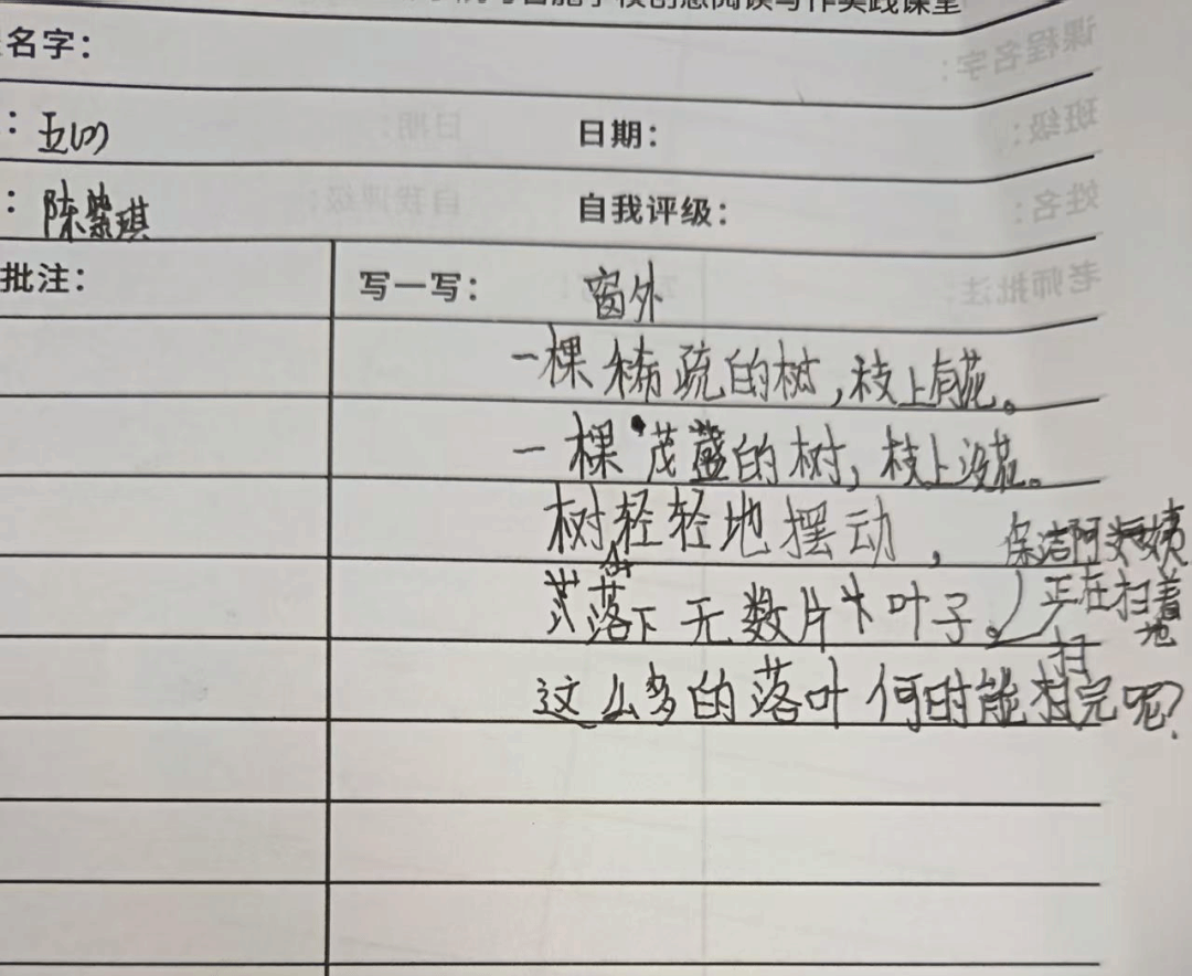 创作环节后,老师展示了部分充满现场感与纯真视角的句子。其中,《窗外》这首小诗尤为引人注目: