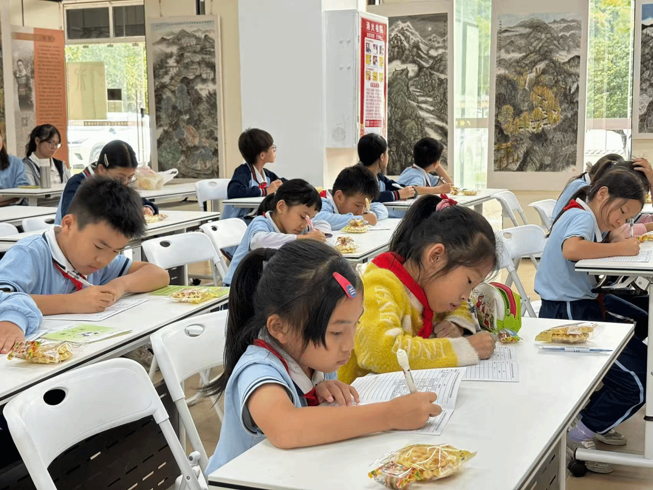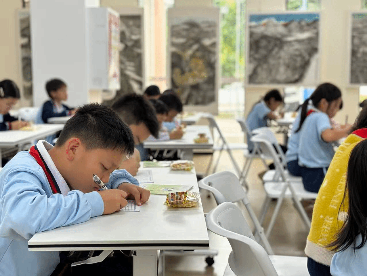 随后,旧海棠老师请同学们尝试用“写生”的方法,描绘窗外的景物或教室内的静物,将刚刚领悟的观察法融会贯通。课堂瞬间安静下来,只留下笔尖划过纸张的沙沙声,孩子们或凝神观察,或奋笔疾书,努力捕捉着光影、形态和瞬间的动静,尽情挥洒着蓬勃的想象力。