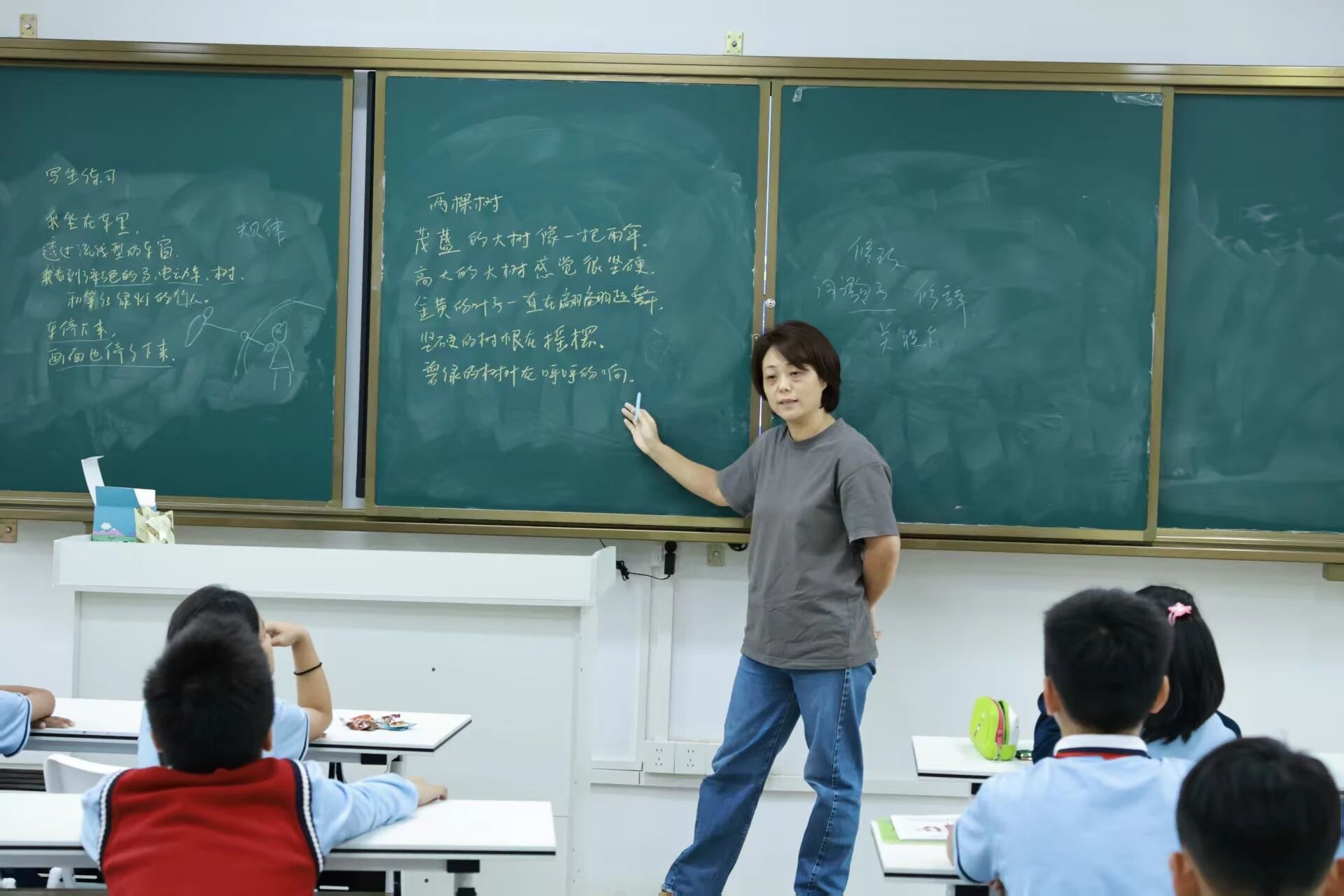 老师通过分析一篇学生诗作(“茂盛的大树像一把雨伞……”),引导同学们现场运用这“三大法宝”进行诊断,同学们都踊跃发言,在这个过程中加深了对修改要点的理解。