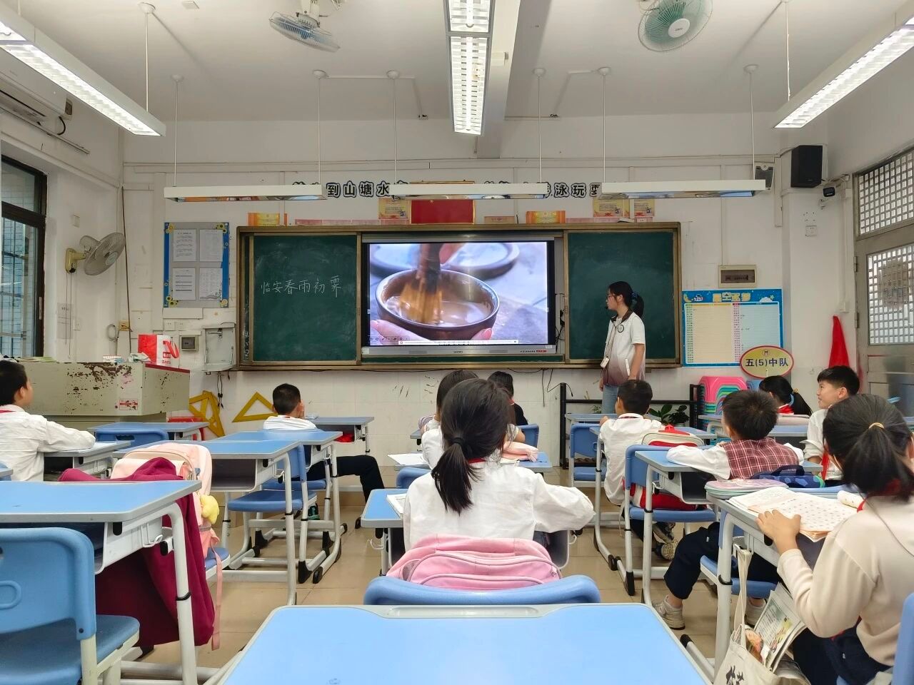 朗读完毕,小卢老师在孩子们意犹未尽之时,将孩子们引入品读诗句的学习当中,在这句“世味年来薄似纱,谁令骑马客京华”中小老师抛出一个问题:“大家来思考一下这句诗用了什么手法?”问题一出,小朋友们便踊跃举手,有人说:“拟人”有人说:“比喻”小朋友们充满童趣的讨论声回荡在教室里,使整个课堂的气氛烘托到高潮。在“晴窗细乳戏分茶”的学习中,小卢老师还以视频的方式让孩子们充分地认识到宋元时期的煎茶之法,拓宽孩子们的认知。