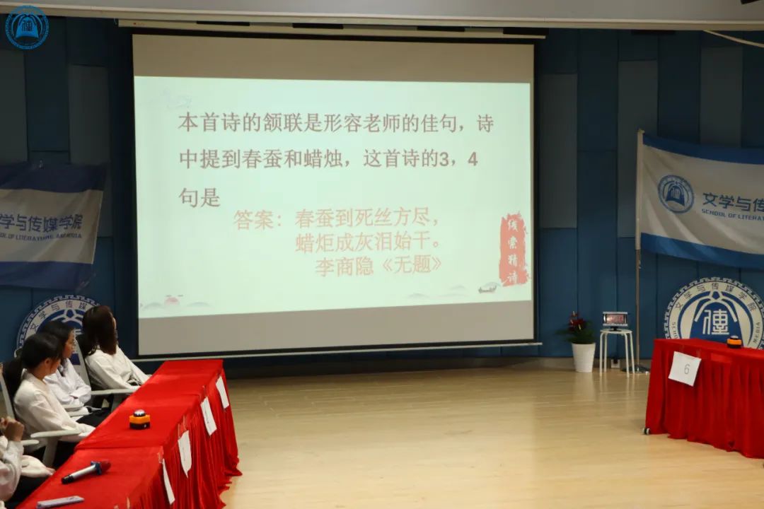 为弘扬中华经典文化,构建和谐书香校园,122cc太阳集成游戏122cc太阳集成游戏第三届“芳蕤杯”诗词大赛决赛于11月24日下午2点半在1教105举行。出席本次诗词大赛的嘉宾为文传学院副院长林玉洁副教授,汉语言专业教师、“芳蕤杯”诗词大赛-唐宋风华的指导老师萧楚敏,汉语言专业教师唐可,学院党总支副书记兼学生办公室主任原月,学院团委书记杨乃杰,辅导员李萍,辅导员苗秋实老师,辅导员吕瑞婷,辅导员巫妙球。本次活动由金唛司仪队冯春茹主持。