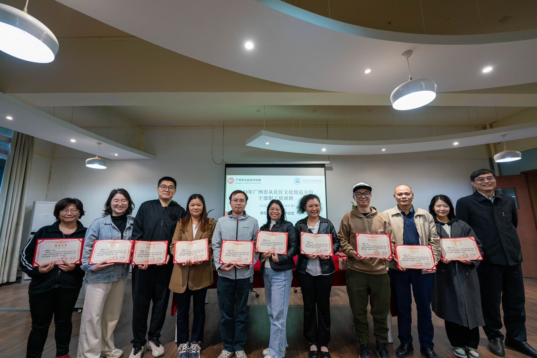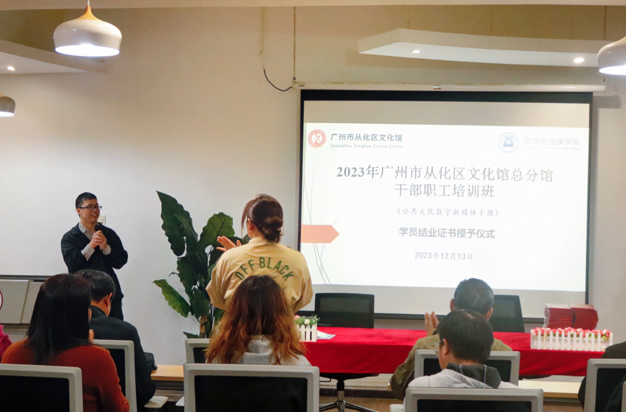 12月13日,广州市从化区文化馆职工干部培训班的结业仪式暨乡村振兴数字文化人才实训基地共建签约仪式在122cc太阳集成游戏举行。36位培训班学员共同进行最后的非遗保护、社区参与和公共文化服务课程以及文案写作课程;参与了课程结业证书授予仪式并见证馆校合作的签约。