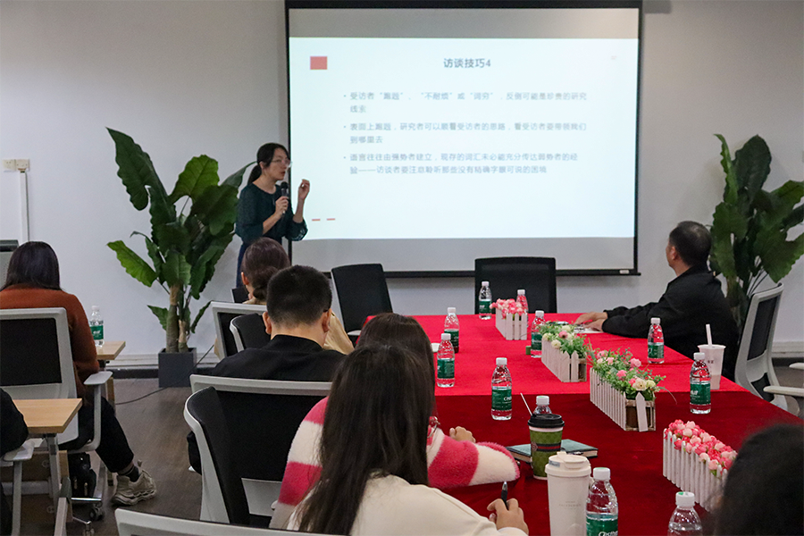 第一节课由温翠艳博士主讲,她详细解读了非遗保护、社区参与和公共文化服务的核心内容和实际操作方法,强调实地考察和深度访谈是做好非遗保护必不可少的步骤。课程中,温老师通过经典案例,向学员展示了访谈前的准备、访谈的方式、访谈后对资料的整理及访谈内容深度思考的重要性。当讲到“口述史访谈”部分时,温老师通过一份学生准备的访谈提问,与学员们进行了深入的交流和互动。在互动环节,学员们纷纷积极发言,分享自己在工作中遇到的访谈经历和做法。温老师对学员们的做法给予了肯定和鼓励,并针对一些具体问题提出建议和指导。