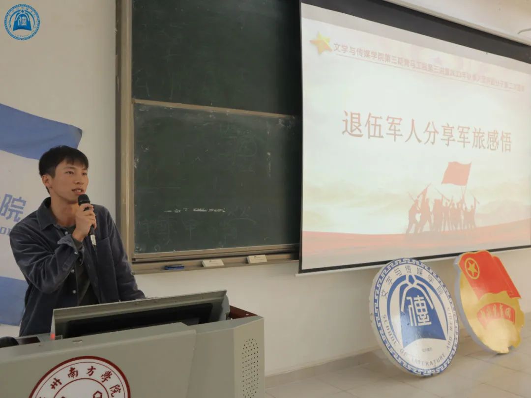 会议第一项,全体同学齐唱团课。在齐唱完激情澎湃的团歌后,三位退伍军人分别分享了他们难忘的军旅生活与独特感受。