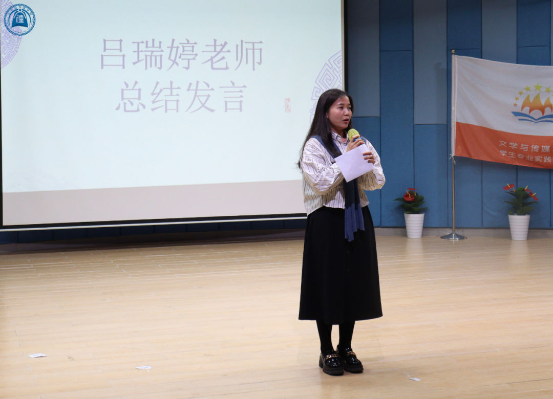 大会的最后,由吕瑞婷老师做最后的总结。吕瑞婷老师表示看到大家过去的收获以及对未来的展望,内心感同身受,她希望大家通过加入自己感兴趣的社团去开拓自己人生更多的可能性。九大专业实践团队的成果离不开学院领导对学生的指导和关怀,也离不开指导老师和学生们的不懈努力。最后,吕瑞婷老师希望同学们铭记以下三点,一是齐心协力,风雨同舟。在接下来的比赛或表演等活动中,要有团队意识,共同成长。一个人可以走得很快,但一群人可以走得很远。二是知行合一,学以致用。大家都有许多闪光点与技能,要将自己的所学所获积极地运用到实践中,在知中行,在行中知。三是不畏困难,迎难而上,始终拿出青年的勇气与魄力,勇敢地直面问题、分析问题、解决问题。