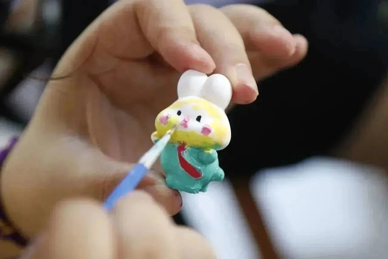 茕茕白兔,在一位位同学的妙手点缀之下,披上了绚丽的彩衣。同学们用手中的画笔大胆创作,全神贯注,想要将自己脑海中的玉兔形象,栩栩如生地出现在自己手上,将石膏兔子装点成独一无二的艺术品,成为一份独特的中秋礼物,体验着手工彩绘的乐趣。