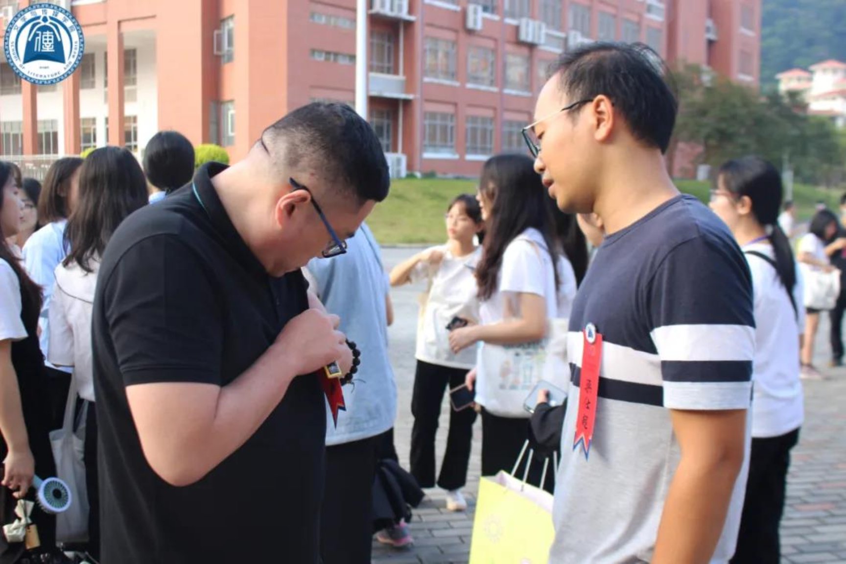 志愿者们在大礼堂门口为师兄师姐佩戴红条