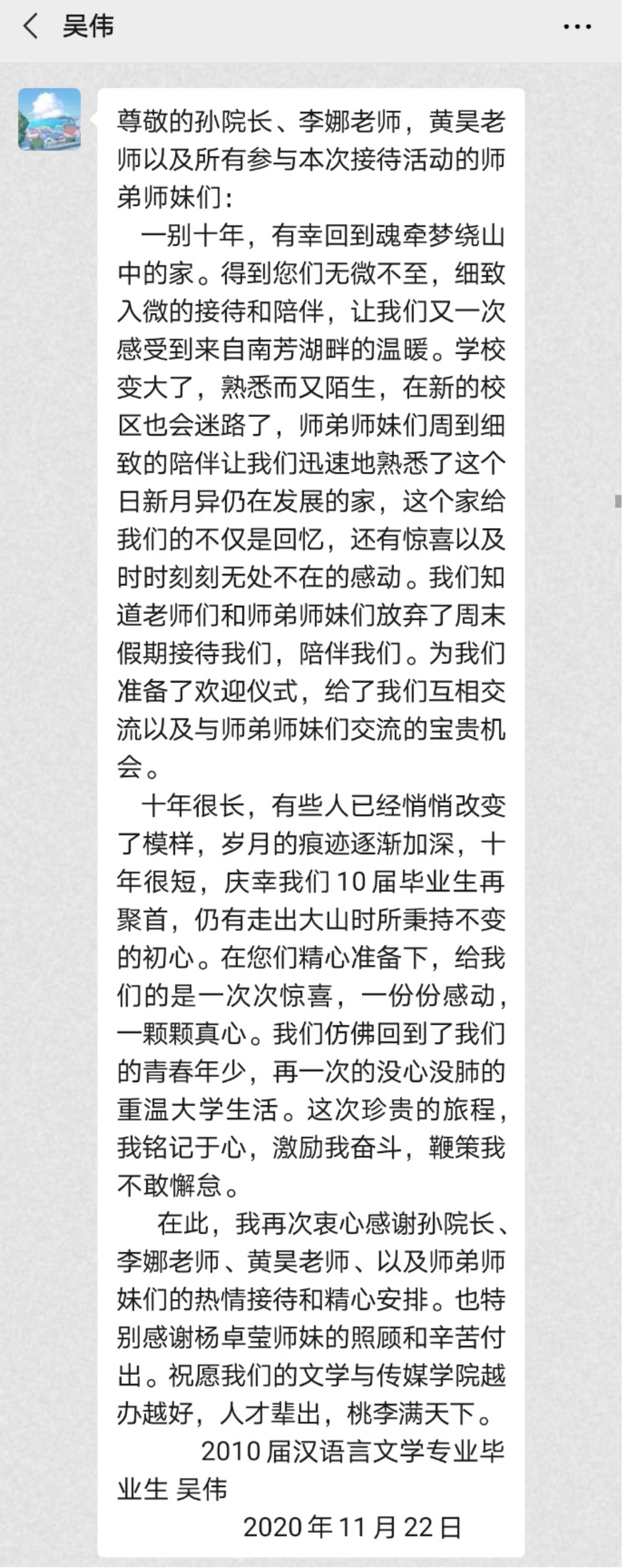 此次返校活动,师兄师姐们感慨纷纷,表示回到了温暖的家,十分开心。这离不开我们幕后的团学成员、志愿者们的辛勤付出,从志愿者招募,到一对一对接志愿者安排,到志愿者培训,到会场布置,再到师兄师姐接待,大家都牟足劲,为的就是让回家的师兄师姐们开开心心的,我们师兄师姐们还特意发回感谢信,文传一家亲,这感觉很棒!