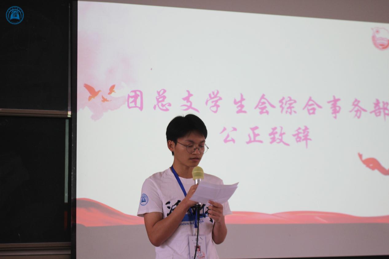 随后,我院学生会综合事务部部长黄南辉上台作评选程序的说明和公正词的宣读。本次评选大会将严格遵守党的政治纪律性和政治规矩,本着对共青团事业高度负责的态度,严肃认真地开展此次评选工作。