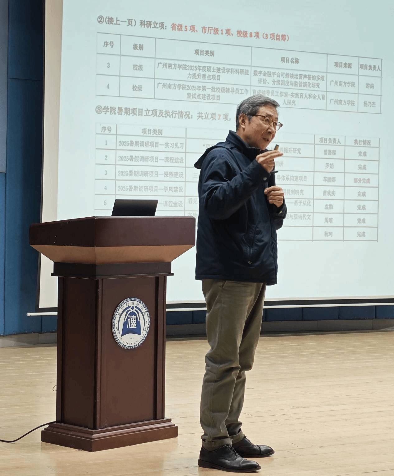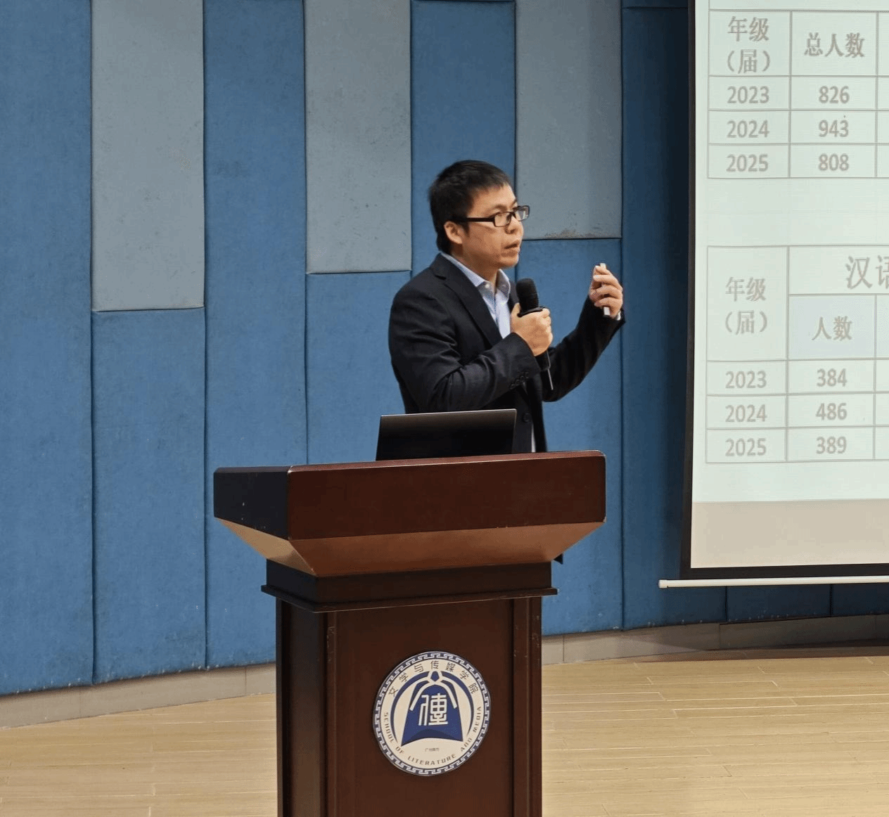 孙立院长围绕师学科建设、教师队伍建设、学术科研、招生就业、文化建设等方面,向与会教师系统梳理了学院2025年所取得的关键成就,并对学院师生一年来的努力拼搏和辛勤付出表示感谢。在盘点成绩的同时,孙立院长指出了学院发展的“短板”:一是高水平科研项目(如教育部人文社科项目)依然缺位;二是汉语言文学专业就业率仍需攻坚克难。孙立院长强调,2026年上半年将迎来教育部本科教学工作合格评估专家进校考察,这是关乎学校和学院发展的“硬仗”。他号召全体教职工以饱满的精神面貌和扎实的工作作风,全力以赴迎接本科合格评估,打赢这场关键战役。