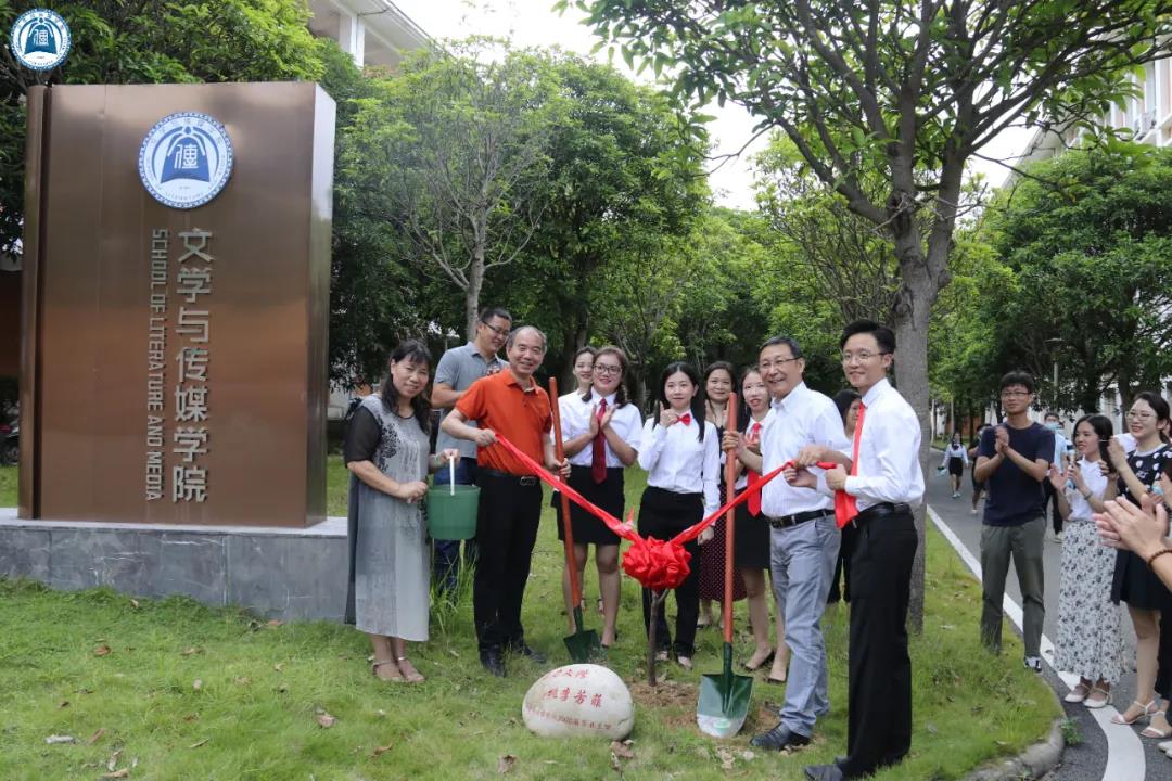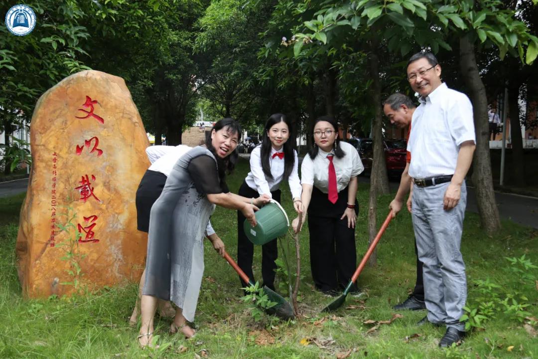 毕业照拍摄结束后,学院教师与学生代表移步到1教前庭,一起种下2020届毕业生赠送的两棵桃树,寓意十年树木,百年树人,文传桃李,文蕴南方。孙立院长、李克和副院长与胡美香教授同毕业生代表一起执铲栽种树苗,学院师生代表共同见证了这温馨时刻。