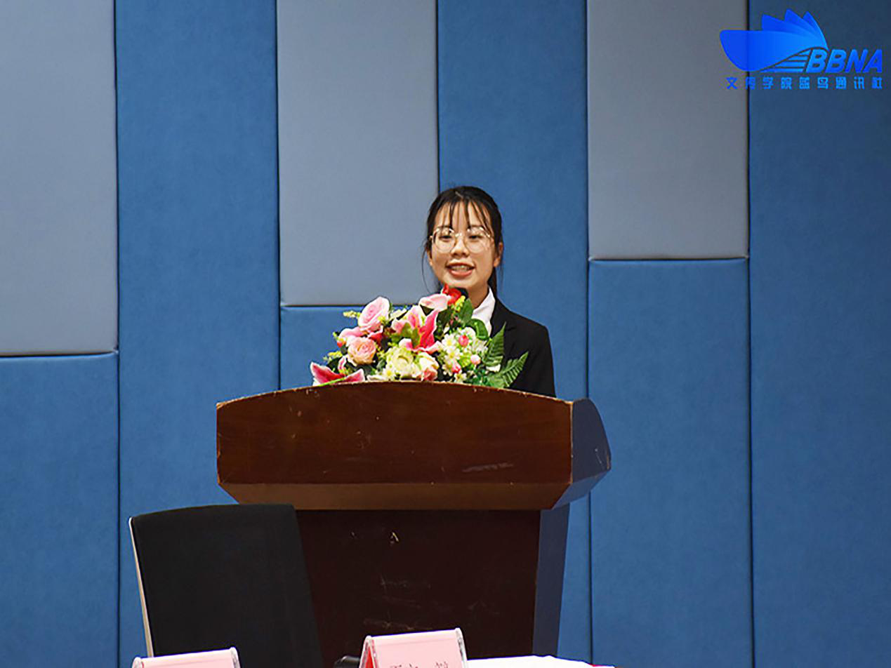 接着,往届冠军队伍代表陈淑铧上台发言。她认为,在辩论中,同学们付出了时间和精力,但是却得到了友谊,能力的提升和精神的满足。她由衷希望同学们积极参加班际辩论赛,享受辩论带给同学的乐趣。