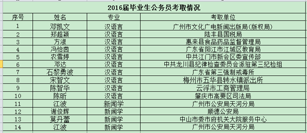 值得一提的是,共有15名2016届毕业生成功考取国内统招研究生及国外研究生,比往年有显著提高:共有6人考取了国内统招研究生,包括华南师范大学、暨南大学、华南理工等等知名学校;共有9人赴境外高校攻读硕士学位。另有,共有14人考取了国家公务员。据了解,2015届毕业生林丹和金悦霞同学今年分别考取了汕头大学和广东外语外贸大学的研究生。