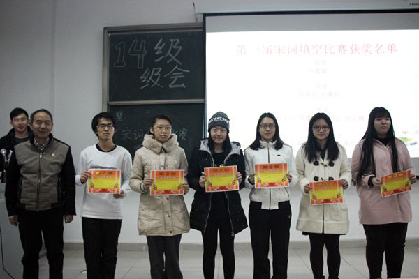 经评选,“第一届宋词填空比赛”共有14名同学获奖。12月17日,李主任为获奖同学颁奖。李主任认为,大学生正处于人生记忆中的黄金时段,已具备一定的理解和欣赏水平,无疑是诵读、熟背古诗词的最佳时机。唐诗宋词是中华文学史上的瑰宝,是中国古典文化的精华。唐诗宋词默写比赛考核了我系学生对经典诗词作品的把握程度,发扬古典文学的继承精神。