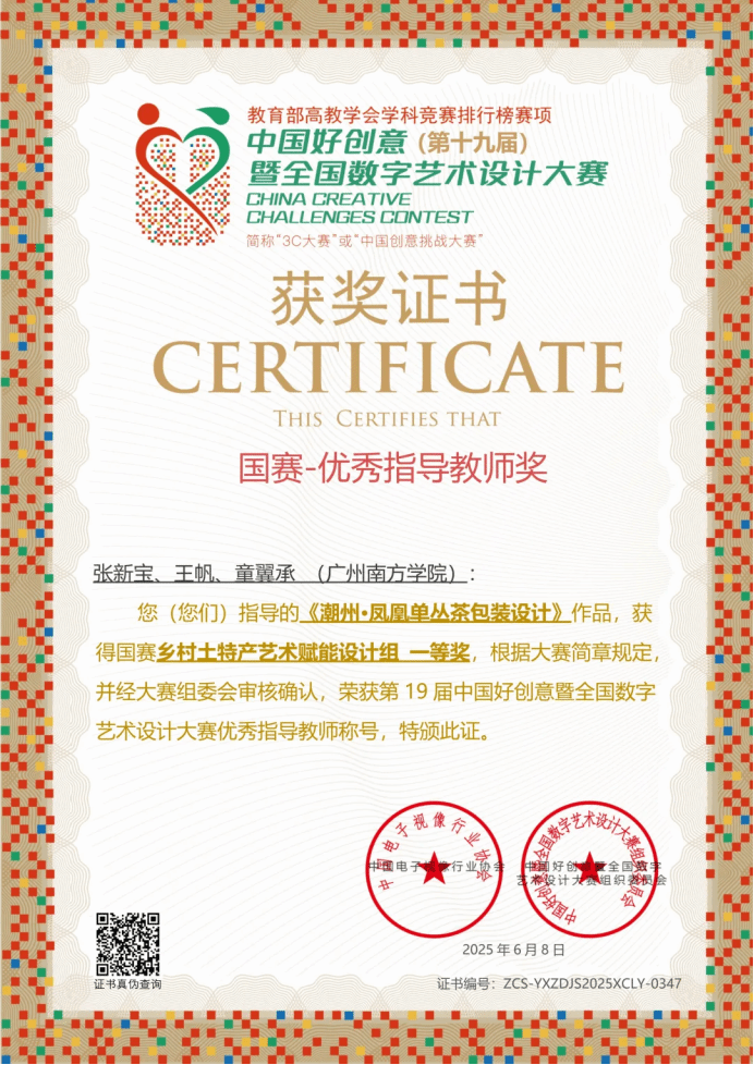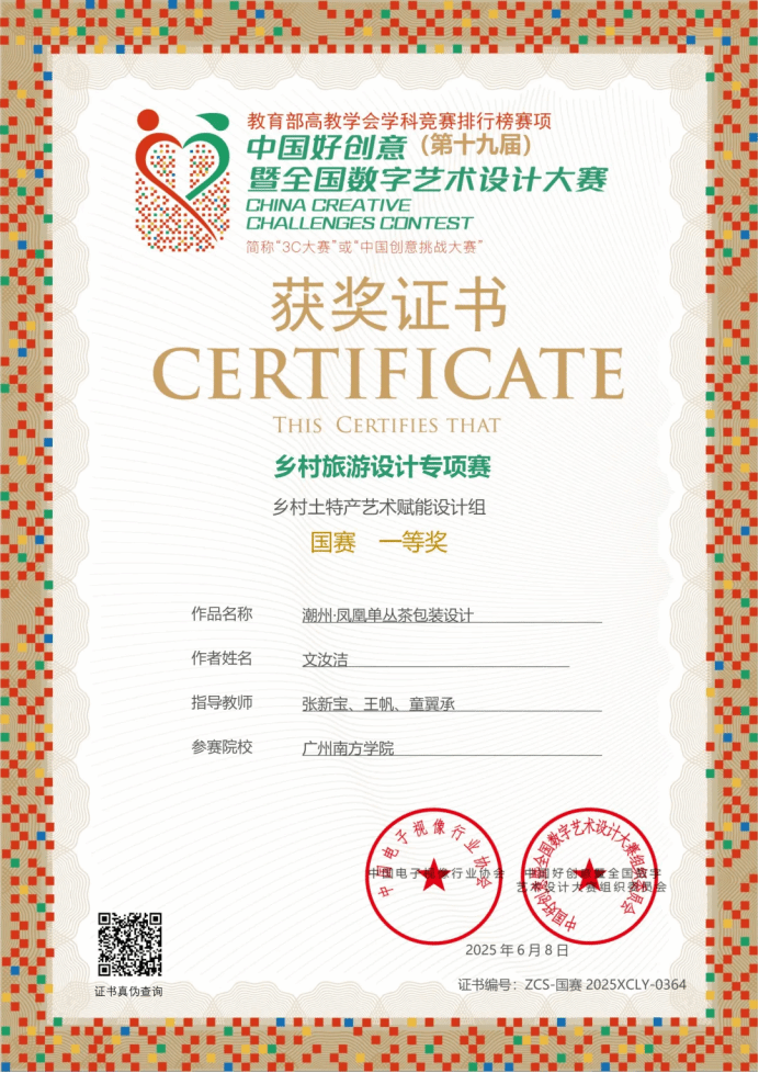 在本次大赛中,122cc太阳集成游戏122cc太阳集成游戏2022级专升本网络与新媒体专业文汝洁同学凭借作品《潮州凤凰单丛茶包装设计》在2000多所高校投出12000多件有效作品中,斩获国家级一等奖;张新宝老师、王帆老师、童翼承老师荣获“优秀指导教师”称号。