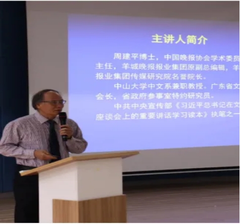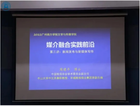 为开阔我校学生知识视野、跟上专业前沿、发掘学术兴趣,引导我校学生广泛涉猎各个学科领域,提升综合素质。10月29日、11月5日,我院特邀中国晚报协会学术委员会副主任、中山大学中文系兼职教授、广东省政府参事室特约研究员、省文化学会会长周建平博士作专题授课。周教授为我校学子进行了主题为《媒介融合实践前沿》的公开授课。开课当天,来自我校20多个专业的221名学生齐聚1教105聆听课程。