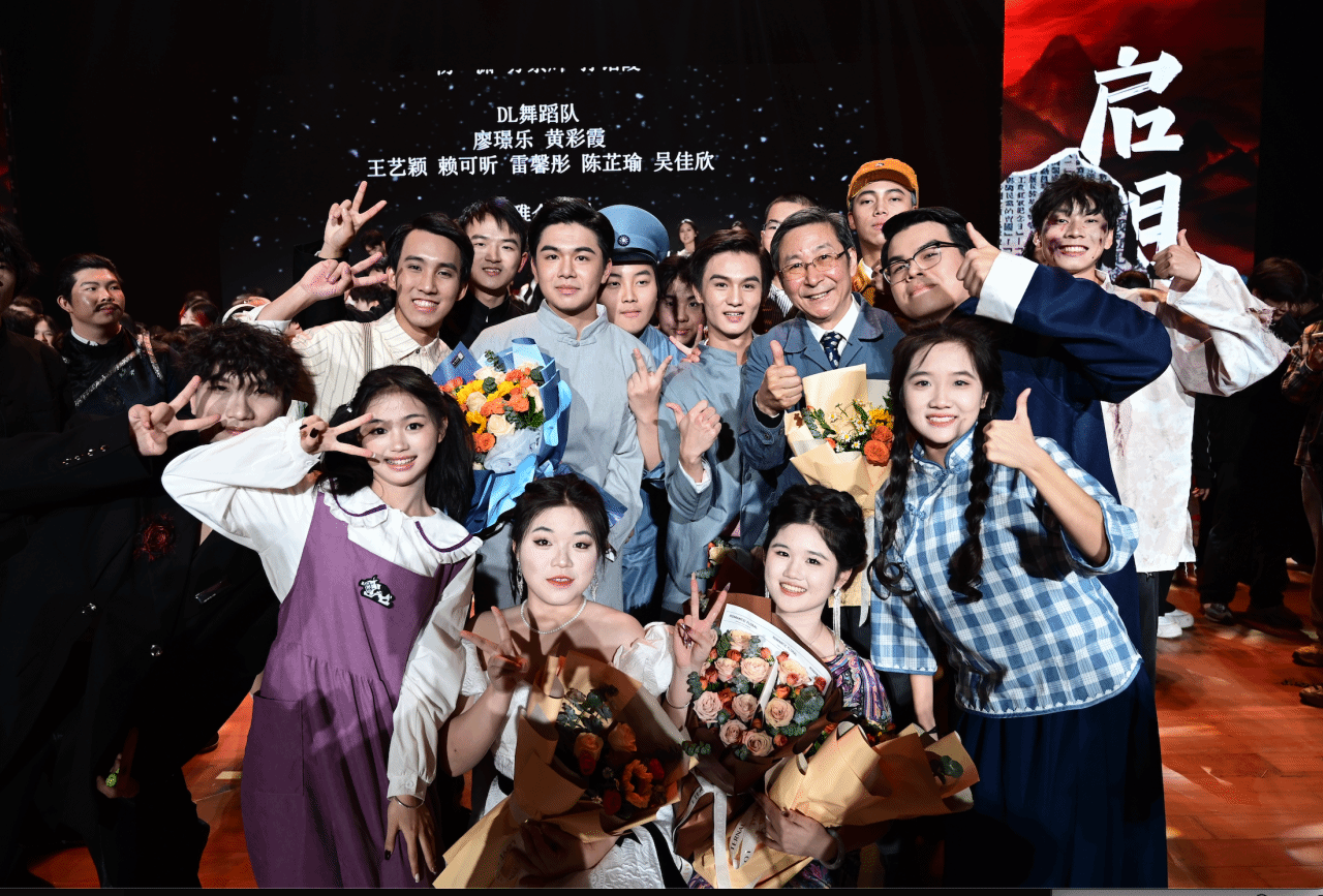 参演教师舞蹈节目《江山水意 & APT.》的新闻与传播系代倩老师在展演结束后与学生合影留念,并表示:“这是今年最好的群像!希望大家能带着青年独有的锐气与朝气,去进行创新创作,去肆意绽放享受青春!作为新老师能深度参与到这一次展演中,深刻体会到戏剧艺术承载精神、传播思想的重要功能,未来将鼓励学生群体创新创作,推动思政教育活起来、实起来,以美育德,以德育人。”