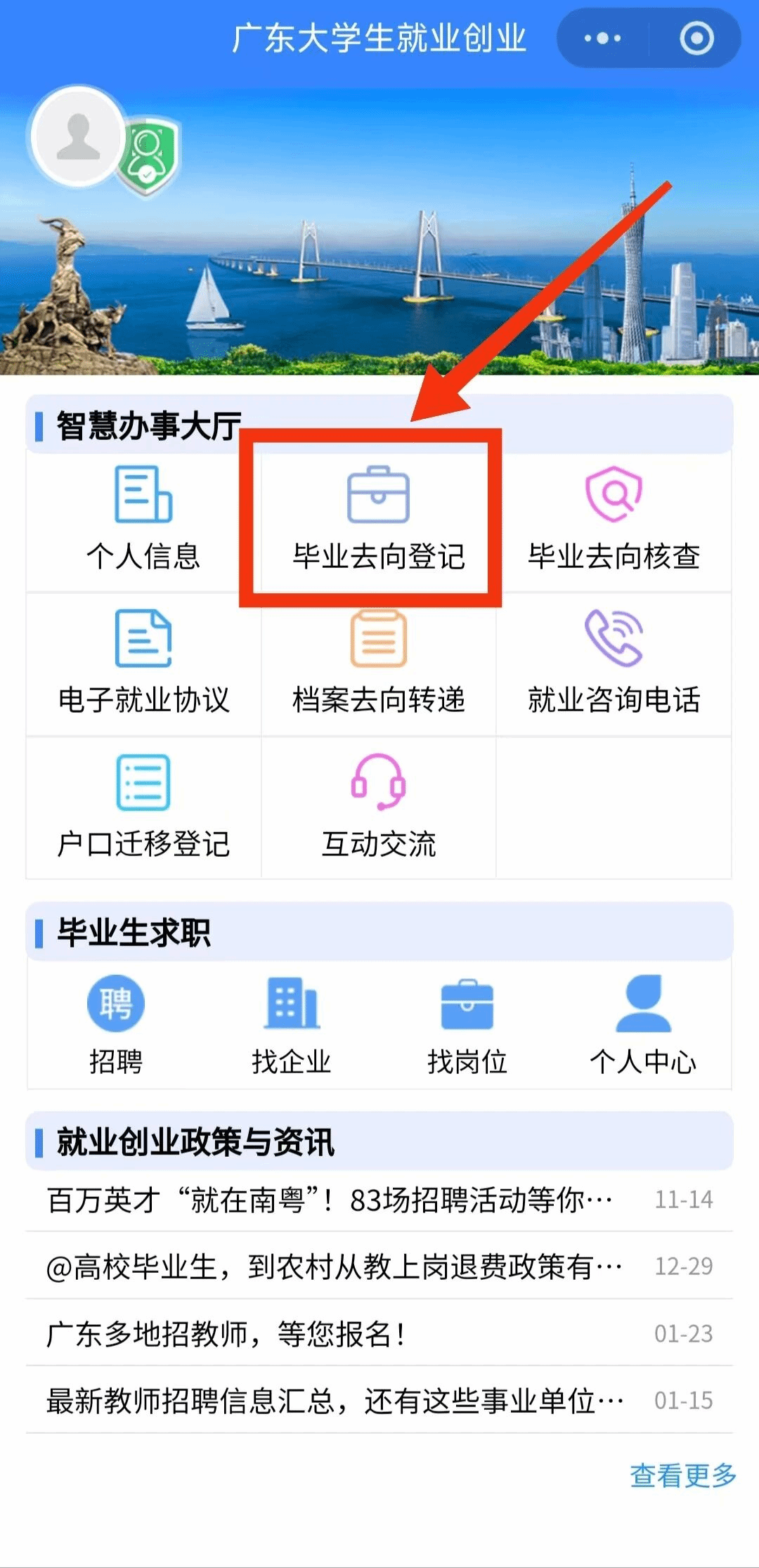 注:须先完成生源上报,如还没完成生源上报,请先点击“个人信息”完成生源上报后再进行去向登记