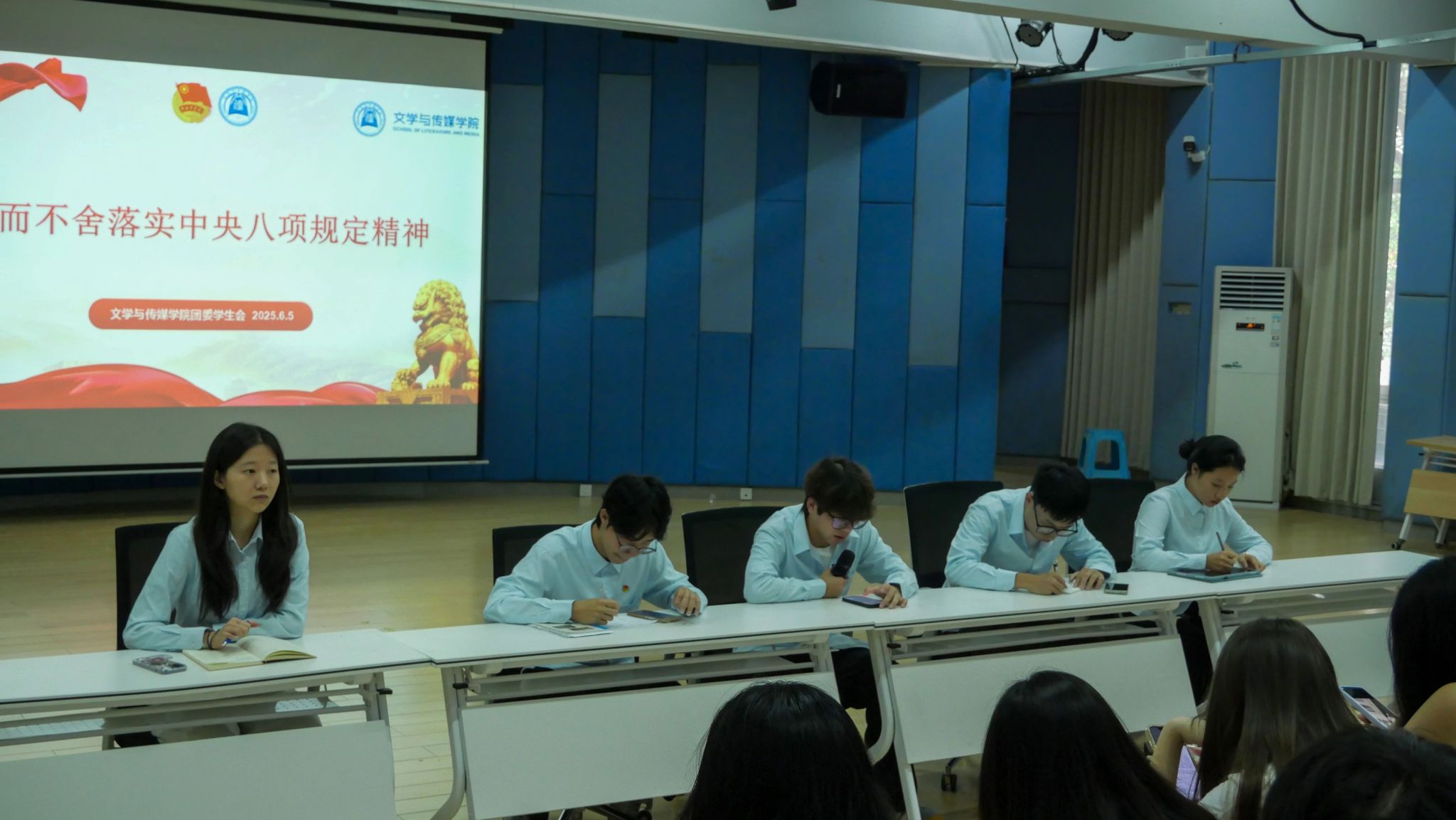 会议伊始,学院团委学生副书记高思杰同学组织开展了“锲而不舍落实中央八项规定精神”专题学习,带领同学们深入解读中央八项规定精神的内涵与时代价值。同学们认真学习并记录,深刻认识作风建设的重要性,深入学习教育,坚定理想信念。