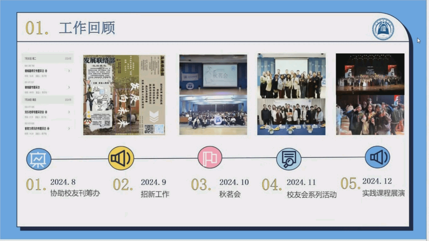 各部门部长依次发言,回顾了本学期的工作情况,重点总结了新干事招新、工作培训以及未来的工作计划。为了帮助新干事尽快适应工作,各部门组织了有针对性的培训会议,干事们的能力在此过程中得到了显著提升。