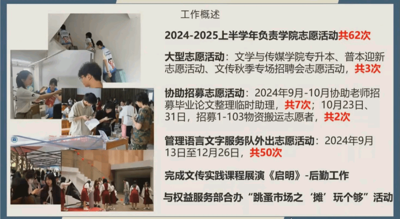 同时,各部门也总结了存在的问题。例如,一些部门工作安排缺乏长期规划,容易出现“临时抱佛脚”的现象,部分成员的工作态度不够积极,参与热情较低。针对这些问题,部门将加强规划和沟通,确保工作的有序开展。