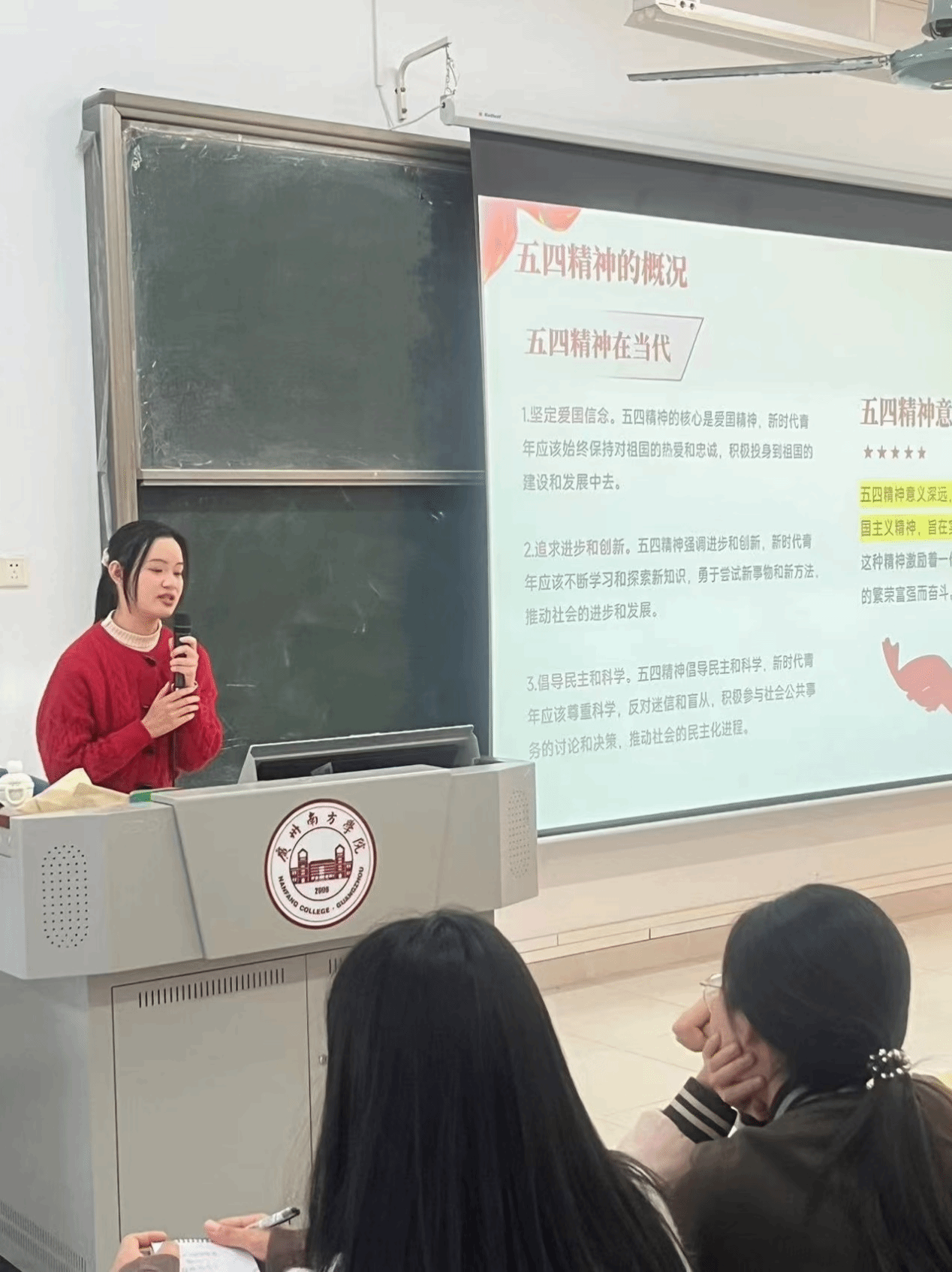 课上,黄慧琪同学巧妙结合五四精神概况、青年与时代使命、勇担使命的案例、如何谱写人生华章四大板块向大家宣讲了当代青年应如何勇担时代使命、谱写人生华章。