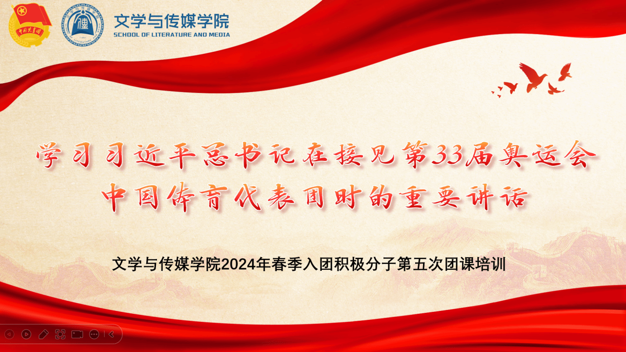 为了深入学习贯彻习近平总书记重要讲话精神,增强入团积极分子理论学习意识,2024年9月25日,122cc太阳集成游戏团委组织部在线上开展了《学习习近平总书记在接见第33届奥运会中国体育代表团时的重要讲话》2024年第五次入团积极分子团课培训,本次团课由潘子怡同学主持。
