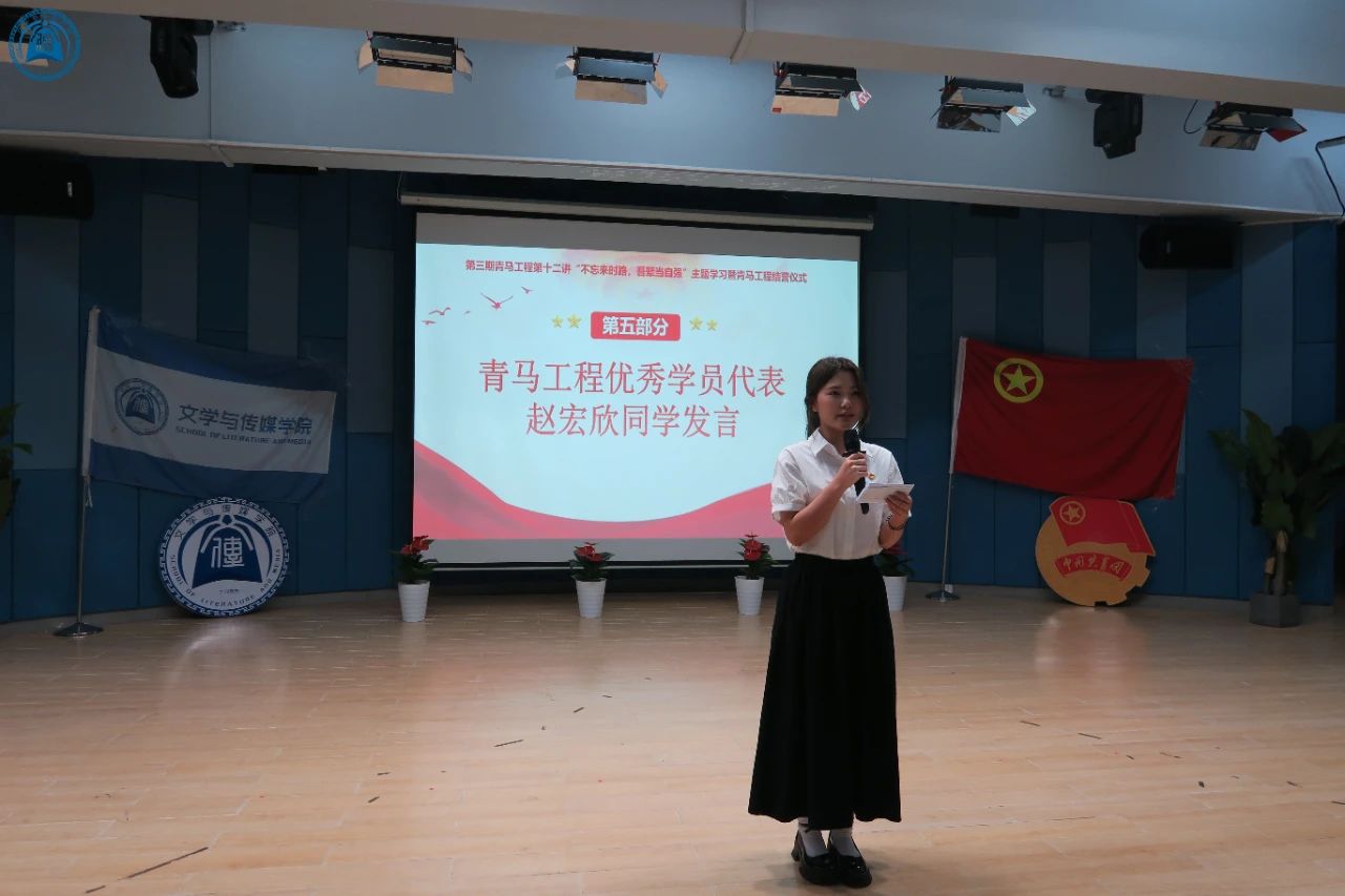 最后,青马工程优秀学员代表赵宏欣上台发言,她表示在青马工程学习过程中收获了知识和友谊,深刻领悟了马克思主义理论的内涵与意义,自己的综合素质也得到了提升,理想信念更加坚定。除此之外,她还参与了团队协作的实践活动,将理论知识运用到实践中。同时,她认为结营仪式并不意味着结束,而是新的开始,她将积极传播马克思主义思想,为实现中华民族伟大复兴贡献自己的力量。
