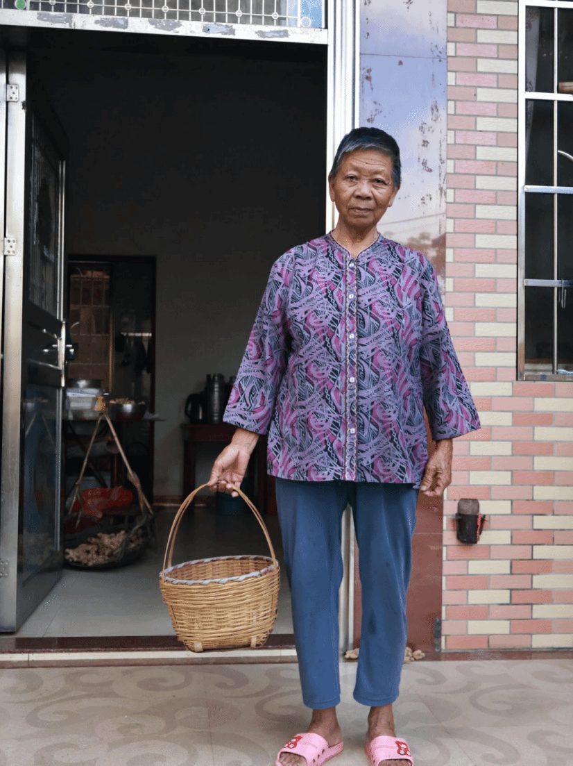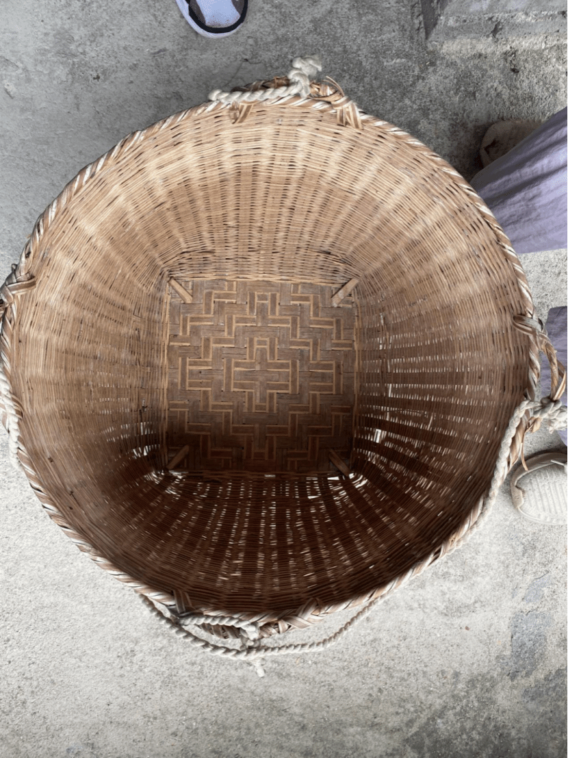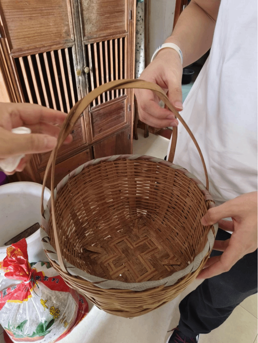 8月14日上午,团队成员们兵分两路,一组对彩莲婆婆进行第二轮采访,另一组则采访竹编手艺人桂花阿姨。在两位老人家中,各式各样的竹编制品随处可见,彩莲婆婆与桂花阿姨向团队成员详细介绍每件竹编器具的用途,有用于晒东西的箩盖仔、拜神用的竹篮等。同时,团队成员了解到,竹器于村里的砂糖橘经济时期再度兴起,为了参与砂糖橘经济发展,她们都曾编织用于装砂糖桔的箩筐。2022年,桂花阿姨在广州市从化区深耕社会工作服务中心的帮助下开始向外售卖自制的竹器补贴家用,于2025年在本村开展的“从一根竹子开始用手认识村子”竹编体验活动中担任活动导师。