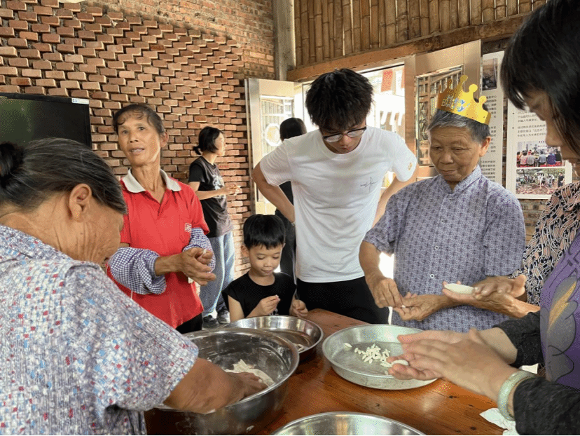 8月13日中午,车辆在蜿蜒的山路行驶近1小时后抵达长流村仙娘溪。村里的“深耕”社工告诉团队成员,当天下午长者饭堂将为老人举办生日会,而83岁的彩莲婆婆和63岁的桂花阿姨作为当地知名的竹编手艺人,正是团队此次调研的重点采访对象。团队成员随即决定加入——坐在老人中间唠家常、一起跳拍打操、揉面搓圆子做糖水……这一过程不仅让团队成员迅速融入当地生活,更重要的是,通过参与式的陪伴,团队成员体会到集体活动对空心村老人的精神慰藉。生日会散场后,彩莲婆婆主动找到团队,成员们借此机会展开对她的第一轮深度访谈。