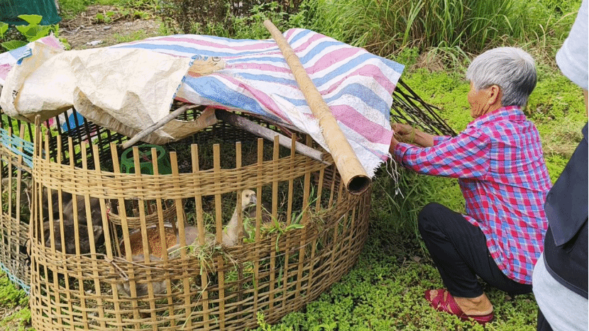 秀凤婆婆搭建小鹅夜晚居住的“防雨”鹅舍