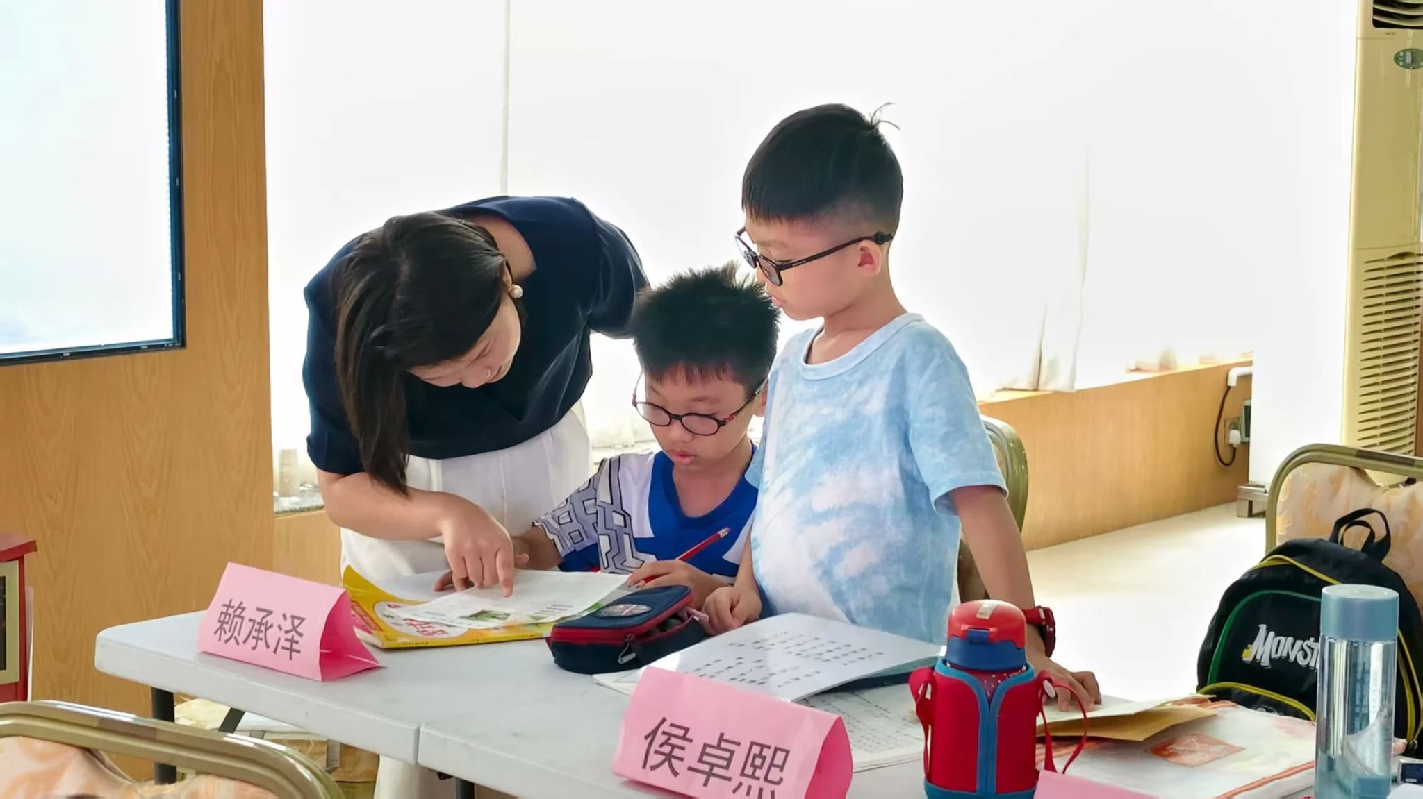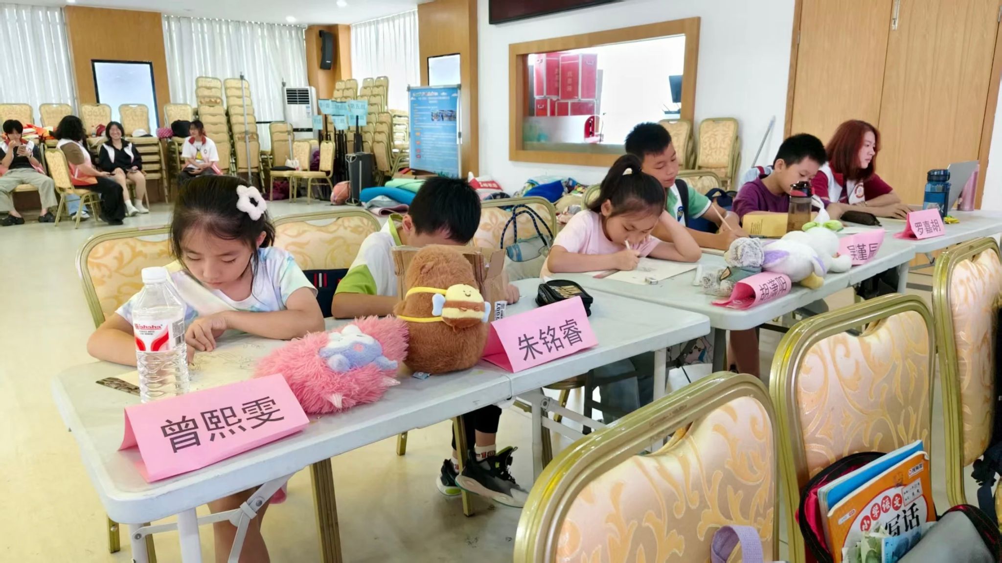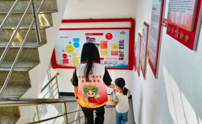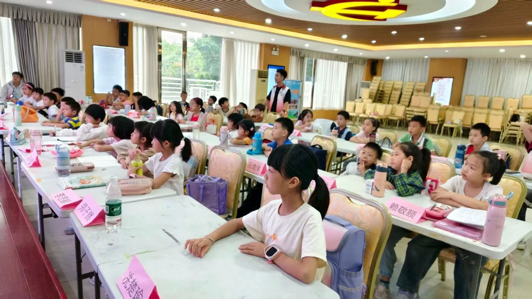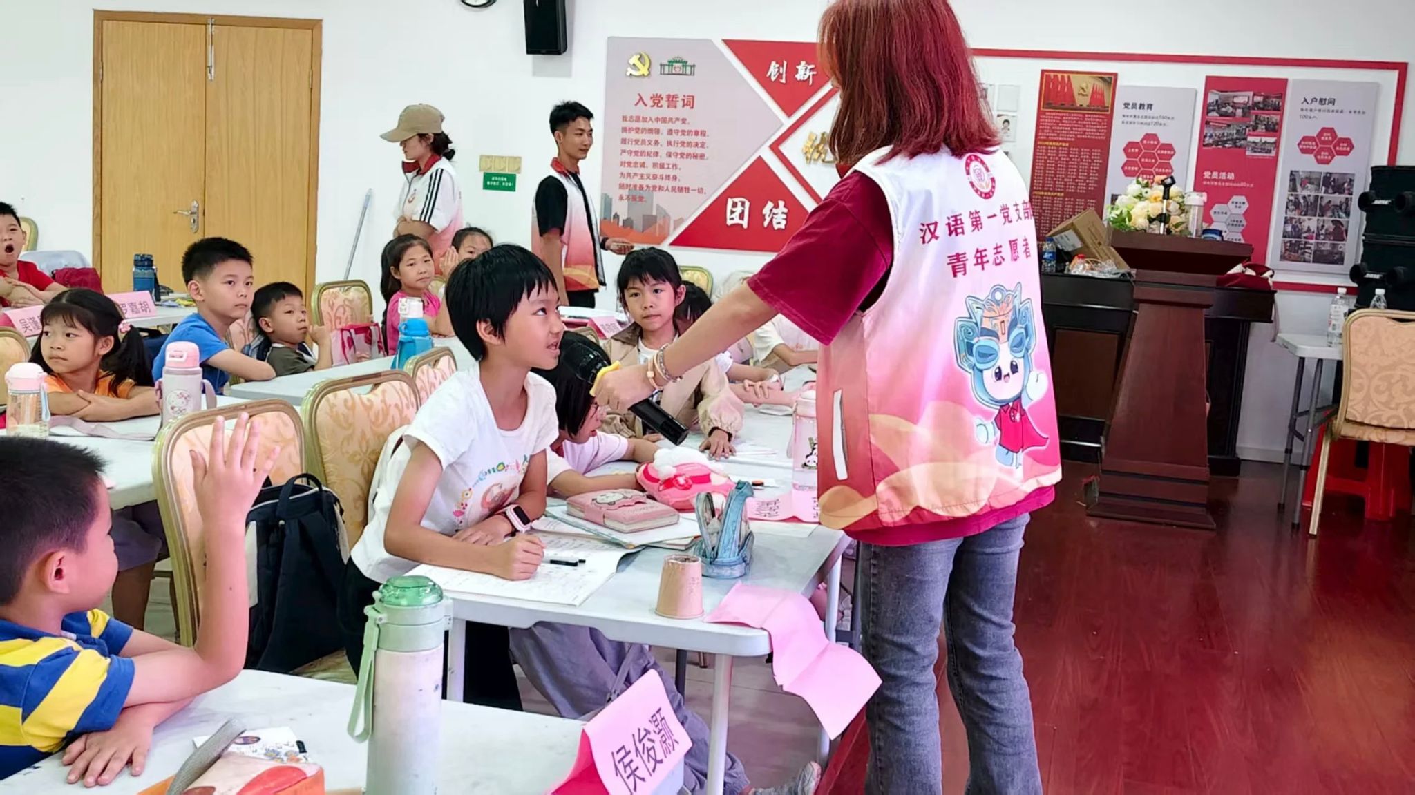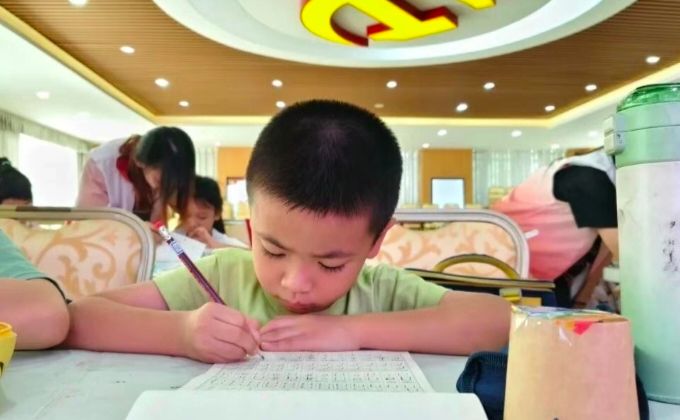 7月15日,“百千万工程”实践活动次日,广东省佛山市顺德区容桂街道振华社区党群服务中心内,两名志愿者八点前便在一楼大厅等候小朋友们的到来,身姿挺拔、面带微笑,目光在入口处寻觅。家长牵着小朋友陆续到来,志愿者赶忙迎上,温和打招呼后微微俯身,轻柔地从家长手中接过小朋友的小手。待所有小朋友均到齐,一天的课程便正式展开。