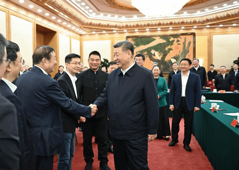 中共中央政治局常委、国务院总理李强,中共中央政治局常委、国务院副总理丁薛祥出席座谈会。中共中央政治局常委、全国政协主席王沪宁主持座谈会。座谈会上,华为技术有限公司首席执行官任正非、比亚迪股份有限公司董事长王传福、新希望控股集团有限公司董事长刘永好、上海韦尔半导体股份有限公司董事长虞仁荣、杭州宇树科技有限公司首席执行官王兴兴、小米科技有限责任公司董事长雷军等 6 位民营企业负责人代表先后发言,就新形势下促进民营经济发展提出意见和建议。
