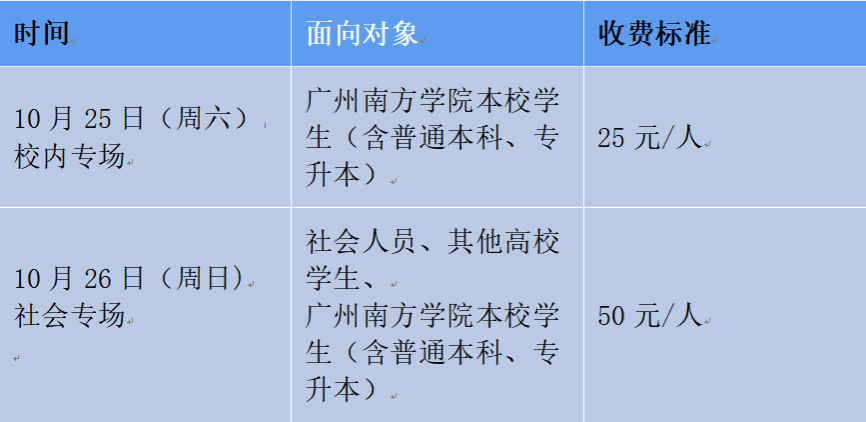 注:122cc太阳集成游戏本校学生(含普通本科、专升本)若报名10月26日(周日)社会专场,缴费标准为50元/人。