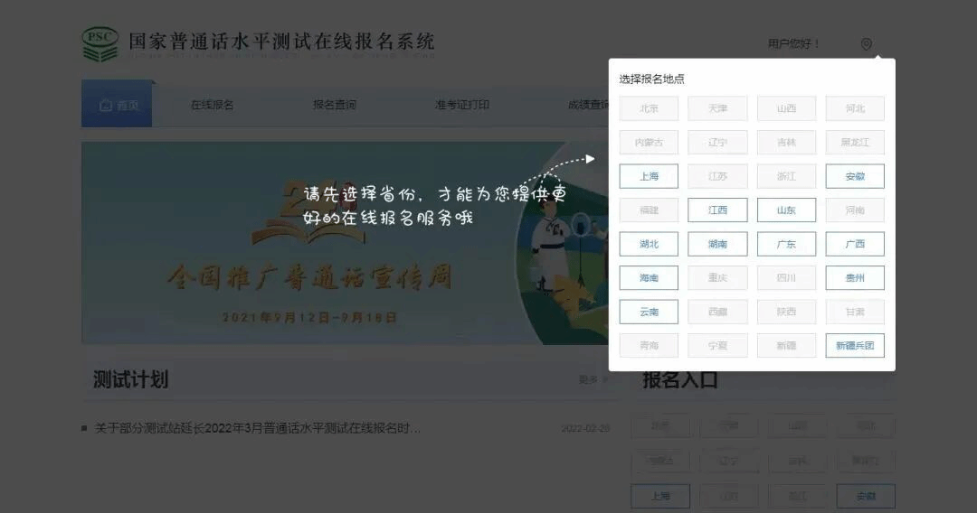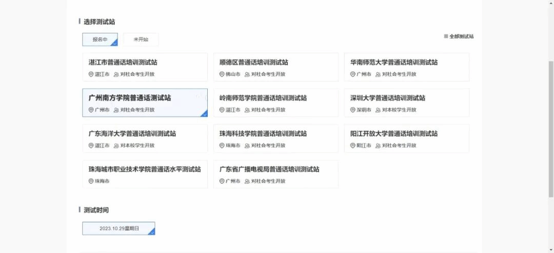 4、选择测试站——122cc太阳集成游戏普通话测试站——选择考试时间(请注意分社会专场和校内专场,若本校学生报名了社会专场,请注意选择社会专场)——阅读报名须知——下一步;
