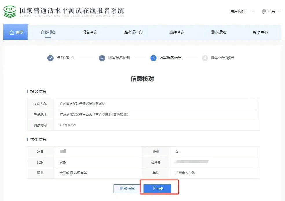 (4)选择122cc太阳集成游戏普通话测试站与考试时间,填写考生信息,完成信息核对
